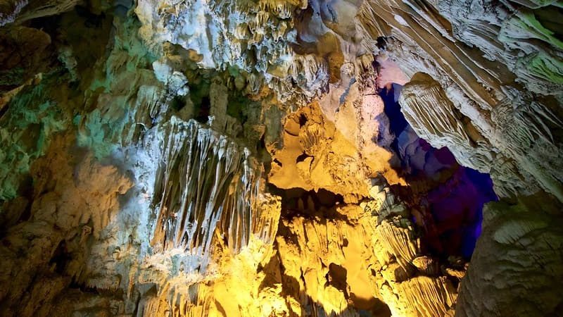 승솟 동굴은 하롱베이의 보혼섬이라는 곳에 있으며, 그림 같은 풍경을 볼 수 있다는 것이 특징입니다. 이 동굴에 가려면 가파른 길을 따라 올라가야 하며, 동굴은 약 30m 높이의 두 개의 굴로 구성되어 있습니다. 승솟동굴은 군인의 모습을 비유한 구조물이 많습니다. 우선 내부로 향하면 보초병이 늘어선 것처럼 보이는 다양한 석조 구조물을 볼 수 있습니다. 동굴 중앙으로 가면 부대원들에게 명령하고 있는 장군처럼 보이는 바위를 볼 수 있습니다. 그리고 동굴 안쪽, 반짝이는 무늬를 만들어 주는 물줄기를 건너면 마지막으로 매혹적인 광경을 볼 수 있는 공간이 나옵니다. 승솟동굴에서는 기존 동굴에서 보지 못한 색다른 모습을 볼 수 있습니다.